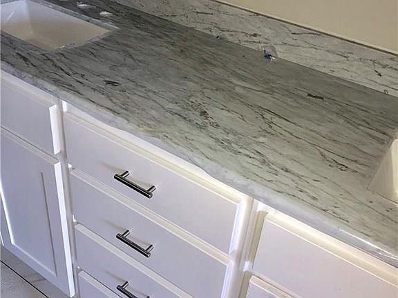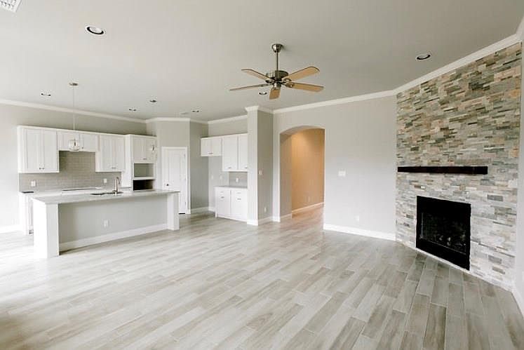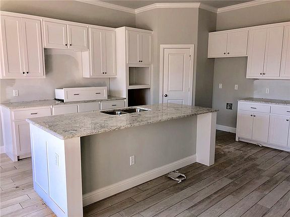 This one is pretty! Custom Build by Parkview Homes. Designer Kitchen,white cabinets, beautiful granite, subway tile backsplash, wood floors throughout main living spaces, Beautiful lighting fixtures that pull the design all together. Split floor plan, One story, Brick and stone exterior, entry way leads to open concept living area and kitchen.
