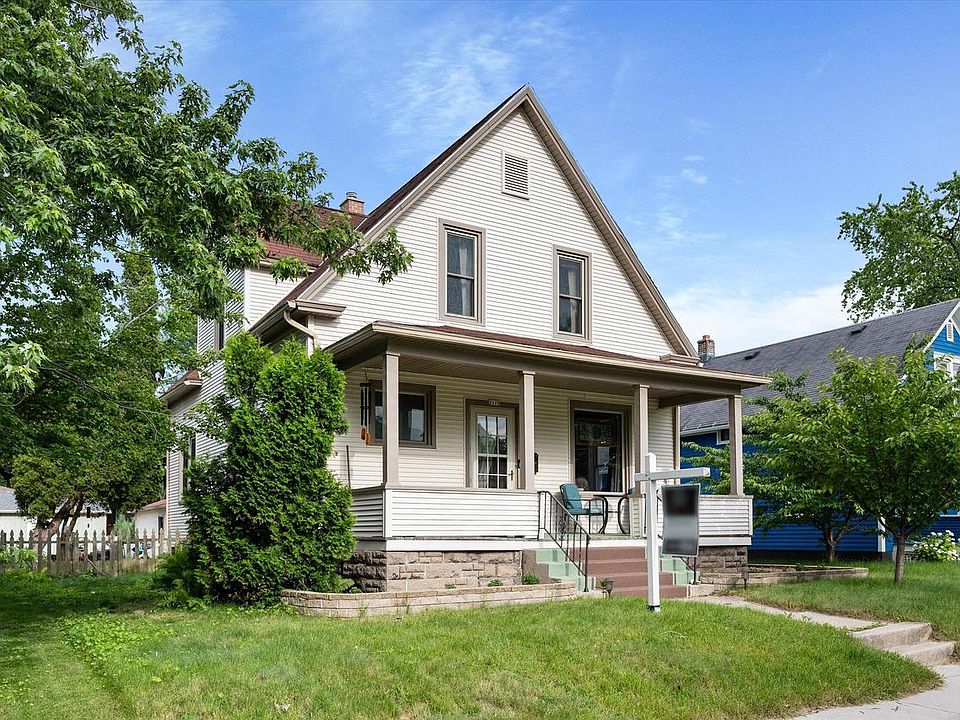 Charming 3+ bed, 2 bath home with classic front porch appeal. Enjoy the warmth of natural woodwork alongside modern vinyl siding. Features a spacious 2-car garage and a bonus -tranquil indoor jacuzzi oasis. Delightful backyard with alley access. Inside, find a large sun filled living room, formal dining room with built-ins, and a remodeled kitchen boasting new cabinets and a pantry. Flexible first-floor space ideal for a family room or 4th bedroom. Upstairs, discover 3 bedrooms and another full bath. Embrace comfort and character in every corner! Just a short walk to Lake Michigan. Do not miss this well loved gem!