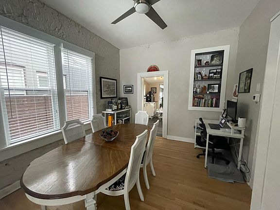 Inside, you'll find high ceilings and large windows that make the home feel bright and spacious. The updated kitchen features quartz countertops, custom cabinetry, a stylish tile backsplash, and stainless steel appliances including a range hood.