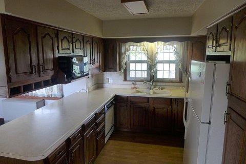 This attractive, 1 1/2-story home offers a remodeled kitchen & dining area, excellent quality trim and has energy efficient heating & air conditioning. Also has a full basement finished with a large family room, kitchen, wet bar, waine coating & bath. Comes with fenced patio and a storage shed. This large, well landscaped lot has a nice country location near town. Stove & refrigerator on main floor, stove and refrigerator in basement, microwave, washer & dryer, couch & bar stools in kitchen all stay. All window treatments and all items presently in home stay. Work bench in garage stays. Electric in-ground dog fence stays. Note: Main floor bath is in the process of being remodeled.