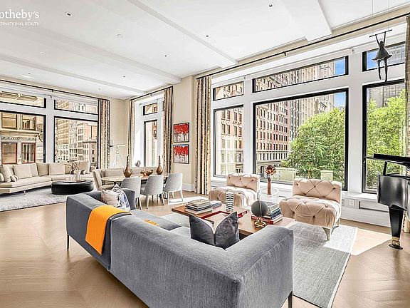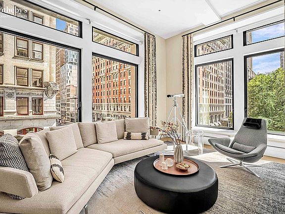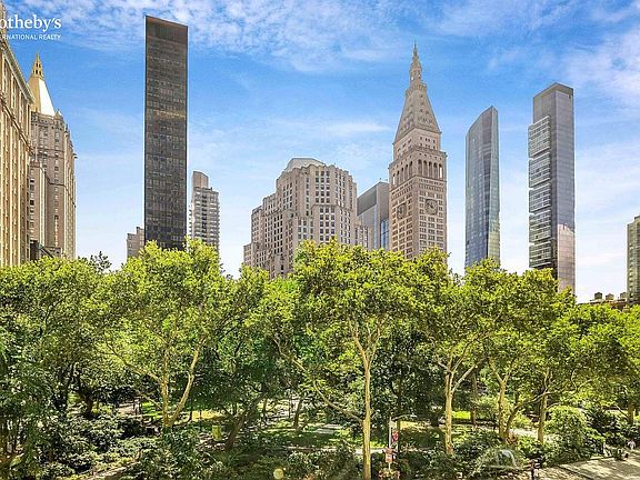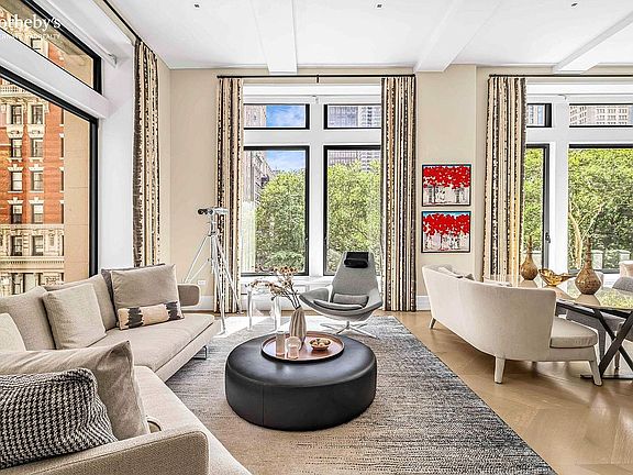A colossal picture window frame offers a breathtaking vantage point of the iconic Madison Square Park, its landscape, sculptures, curated art, and the surrounding buildings of old New York. This one-of-one residence in 212 Fifth Avenue has soaring 13-foot ceilings and an expansive fifty-seven feet of full frontal, unobstructed, awe-inspiring park views both in its great room and primary suite. Designed by Eve Wildrick who brilliantly incorporates the picture frame view and prewar architecture with a contemporary flair imbuing the home with a comfortable, inviting elegance. The drama begins in the grand foyer with its book-matched Calacatta marble hand selected from Italy. The gallery hallway opens into the gracious entertaining space which includes a cocktail area, grand piano, dining area and corner living room. The integrated high-end chef’s Gaggenau kitchen offers bar dining, custom ash wood cabinetry and 4-inch thick Calacatta marble. The living room opens into a media room with custom pocket doors. This room can also serve as a third bedroom or guest room with en-suite bath. The bedroom suites are kept intentionally separate for privacy in a classic wing configuration. Only the finest quality materials coupled with the best craftsmanship were employed throughout the home. The primary bedroom with its park facing vista includes a dressing room closet, spa bath with radiant-heated Thassos stone floors, fluted Carrara marble walls, solid surface Lacava tub, double vanity, and Waterworks fixtures. The secondary bedroom features an en-suite bath with soaking tub. Other features include a stunning powder room, washer/dryer, solid hardwood floors in a stylish Chevron pattern, fresh air vent, and smart home technology with electronic blinds, all off and on switch, HVAC system zones, and a sound system. Included with the sale is a storage unit.