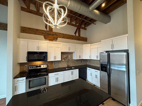This 4th-floor apartment features an expansive open floor plan with tall ceilings, oversized windows, and beautiful exposed brick walls that bring in historic charm. The large kitchen includes granite countertops, a full tile backsplash, stainless steel appliances, a dishwasher, and a spacious center island perfect for cooking or entertaining. Tiled flooring in both the kitchen and bathroom provides a clean, modern finish, while chandeliers, barn doors, and remote-controlled ceiling fans and lighting add thoughtful style throughout. The generous living room offers plenty of space, and the versatile bonus area can be used as an office, dining room, or oversized mud room depending on your needs. With elevator access and an updated layout designed for comfort and functionality, this home delivers an exceptional downtown living experience close to restaurants, transit, and entertainment.
