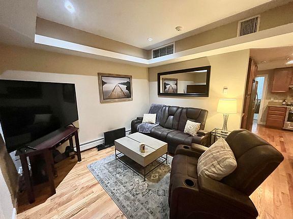 Desirable downtown location. This well-maintained unit features an open floor plan with a spacious living room and an upgraded kitchen complete with solid oak cabinets, granite countertops, and stainless steel appliances. The living area includes crown molding and recessed lighting.Bedrooms are located on opposite sides of the unit, each offering generous closet space and plenty of natural light. Additional features include hardwood floors throughout, central A/C, in-unit washer/dryer. Enjoy a large shared backyard and proximity to NYC transportation.