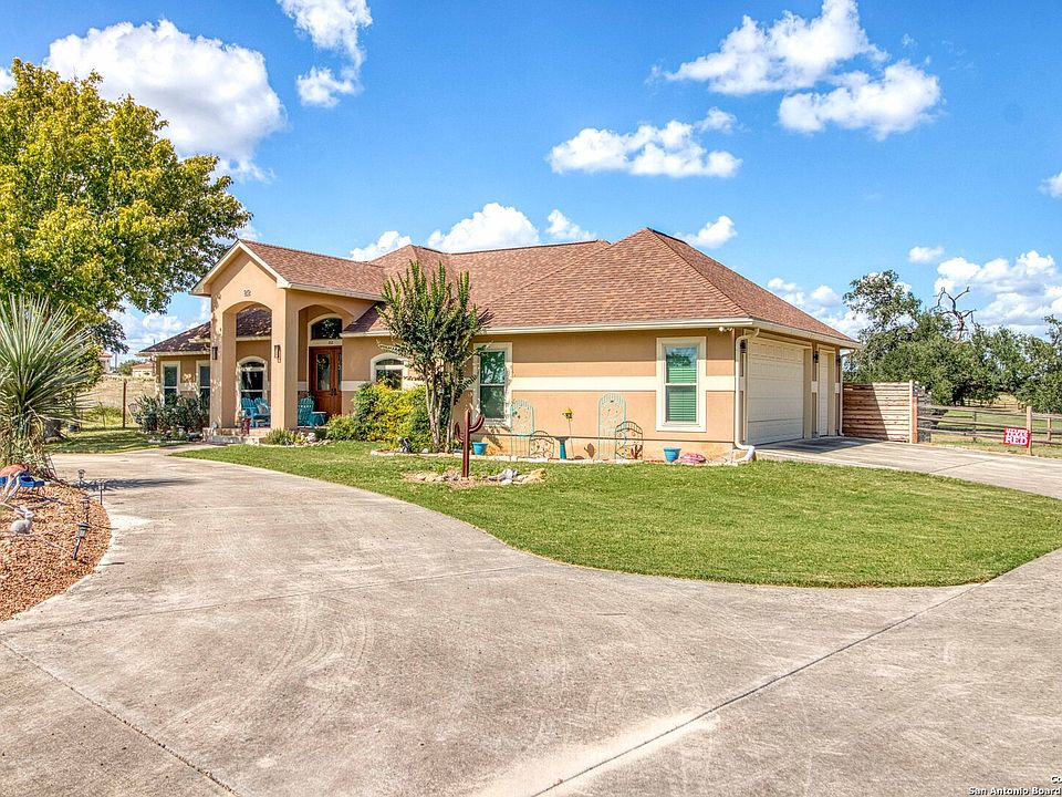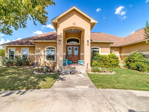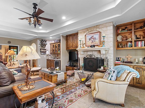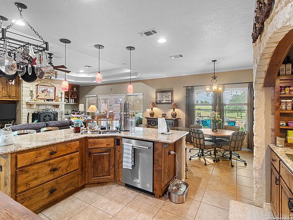 This exceptional Scott Asher Custom home is a showcase of craftsmanship, luxury, and thoughtful design, nestled in an unbeatable location on the 16th fairway with sweeping Hill Country views. Step inside to an expansive open floor plan with soaring ceilings, a dramatic stone fireplace, and a private office perfect for work or quiet reflection. The heart of the home is a chef's dream kitchen-featuring gleaming granite countertops, premium stainless steel appliances, a generous breakfast bar, and stunning custom alder cabinetry that flows throughout the home, adding warmth and elegance to every space. The master suite is a true retreat, anchored by a spa-inspired bathroom that exudes indulgence. Relax in the freestanding copper soaking tub, refresh in the oversized walk-in shower with dual shower heads. Perhaps best of all you won't have to worry about running out of hot water because the home features a commercial grade Marathon 80 gallon hot water heater. Outside, the oversized two-car garage is complemented by an attached golf cart garage-perfect for both storage and convenience. Enjoy the outdoors from the screened-in porch or entertain on the expansive custom stone patio spaces surrounded by lush landscaping. A full sprinkler system keeps everything green and vibrant year-round. Every inch of this home reflects meticulous attention to detail, from the layout to the finishes. With its unbeatable location and luxurious features, this property is truly one-of-a-kind.