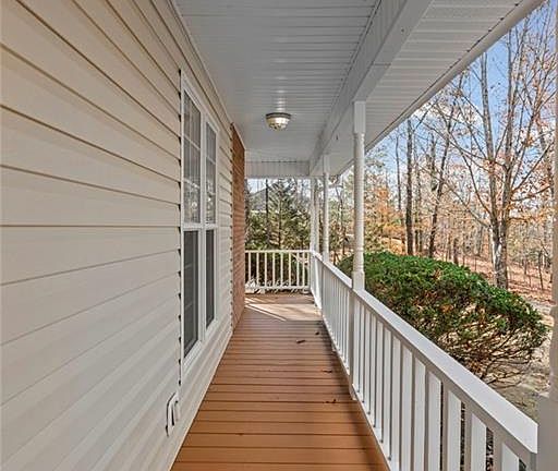 Welcome home to this inviting brick-and-siding ranch tucked into a quiet, wooded setting. A classic covered front porch welcomes you inside, where natural light fills the open and comfortable interior. The spacious kitchen features warm knotty-pine cabinetry, stainless steel appliances, an island for prep or casual dining, and direct access to the back deck, perfect for enjoying the surrounding trees and seasonal views. The kitchen opens to a large living room with a vaulted ceiling and a brick fireplace that adds a cozy focal point for gatherings. The primary suite offers a roomy layout with dual closets, a tray ceiling, and an en-suite bath with double sinks and a large shower-tub combo. Two additional bedrooms and a second full bath provide flexibility for family, guests, or a home office. Downstairs, the expansive finished basement offers endless potential, storage, a workshop, future living space, or a home gym. With open framing and high ceilings, it’s a blank canvas ready for your vision. This home blends privacy, comfort, and room to grow, ideal for anyone seeking peaceful surroundings with plenty of usable space.
