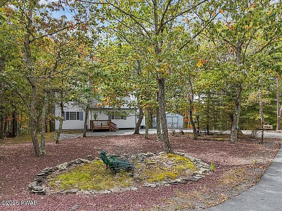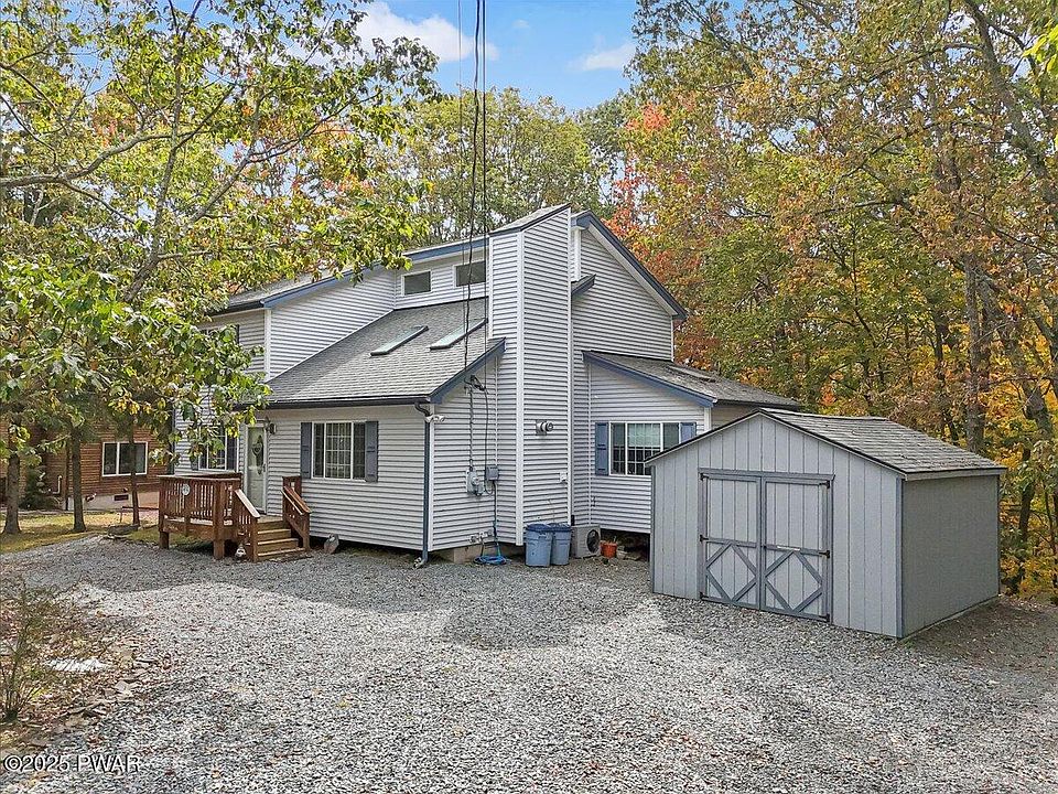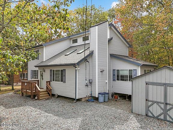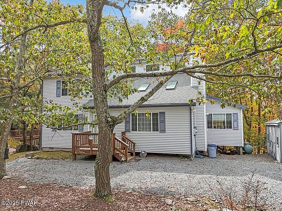 A beautifully maintained 3 bedroom, 2 bathroom home at the end of a peaceful cul-de-sac in Tanglwood Lakes! The lovely homes sits in one of the quietest locations in the whole community, has plenty of parking, and a great shed for storage! The back deck is perfect to relax and take in the view! Inside you are greeted by a nice open living space with real hardwood floors. The living room features a floor to ceiling stone faced propane fireplace to enjoy and opens right into the dining area. Off the dining room you will find a lovely sitting area with lots of light - perfect for plants, a reading nook, or an office. The large kitchen has wood cabinets and granite countertops to enjoy. Also on the main floor is the primary bedroom, full bathroom, and laundry! The second floor features a large multi-purpose loft that overlooks the large living room below. You will find an additional two bedrooms and full bathroom on this floor. This is a great home in a sought after lake community. Enjoy Tanglwood Lake, which is a peaceful non-powerboating lake where you can enjoy kayaking or fishing. In addition, there is a beautiful sandy beach on Lake Wallenpaupack with a picnic area and pavilion. You will also find a playground, walking trails, and a fitness center within the community along with many miles of well maintained, paved roads. This is a property you are not going to want to miss!