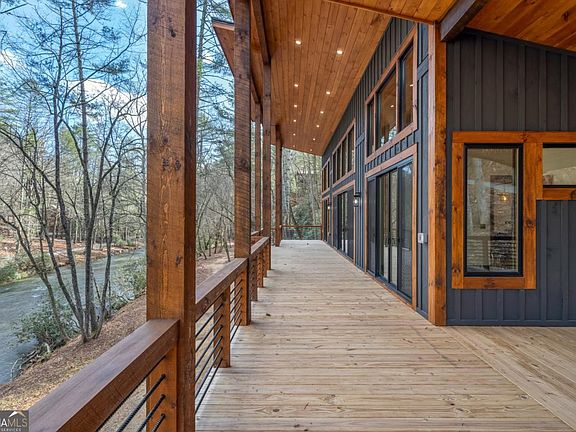 WATERFRONT LUXURY! Perfectly situated above the rushing waters of Mountaintown Creek, this home delivers a lifestyle as rare as the trophy trout that swim past your backyard. 4 Bedrooms | 4 Baths | 4 Fireplaces! Set within the intimate, gated community of Fish Tale Cove, this showpiece residence is just minutes from downtown Ellijay yet feels worlds away. With all paved roads, high-speed internet, and unbeatable access to nature, it's the perfect blend of convenience and serenity. Step inside to soaring 16' ceilings, walls of glass overlooking the water, and a dramatic stone fireplace that anchors the open-concept great room. The gourmet kitchen shines with Z-Line appliances, custom cabinetry, and a gathering-sized island-ideal for entertaining family or guests. Four en-suite bedrooms provide privacy and comfort, while the primary suite is its own spa-like retreat with a soaking tub, tile shower, and rustic-chic finishes. The terrace level is an entertainer's dream with 10' ceilings, a stylish bar, a stone fireplace, and direct access to the outdoors. Expansive porches-including two covered party porches with fireplaces-invite you to enjoy the sights and sounds of the rushing rapids year-round. Outdoors, over 900 feet of walkable trails along the creek and a private river beach invite endless adventure-cast a line, launch a kayak, or simply relax to the music of the water. With all-usable frontage (a rarity in mountain properties), this is river living at its finest. Few properties offer such direct access to Mountaintown Creek, a protected Class A Trout Stream prized by anglers for its pristine trout habitat. With its rushing waters and reputation as one of North Georgia's premier trout streams, this is among the most sought-after waterfronts by both locals and visitors. Investment Bonus: Projected short-term rental income of ~$95K annually makes this property both a luxury retreat and a smart investment. Not just a home, a lifestyle-Fish Tale Cove.