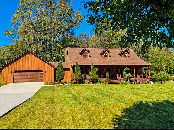 The grounds are just as impressive as the home itself. Enjoy beautifully curated landscaping, a koi pond with a natural water filtration system, and two oversized covered porches (46' x 8') on both the front and back of the home — perfect for relaxing or entertaining. The home was professionally stained within the last two years (rated for 35 years) and features a newer roof (within last 2 years), leaf-guard gutter systems, and downspouts. The fully updated septic system, two matching storage sheds, and newly installed culverts with county-maintained drain tiles add even more peace of mind. Thoughtful landscaping is throughout the property that brings the property to life with intentional placements and staging.