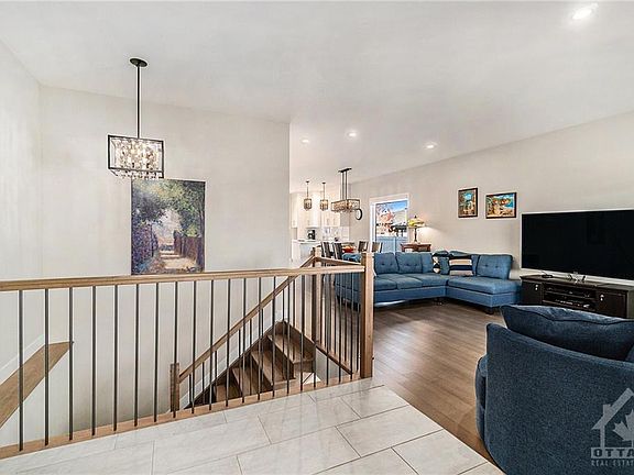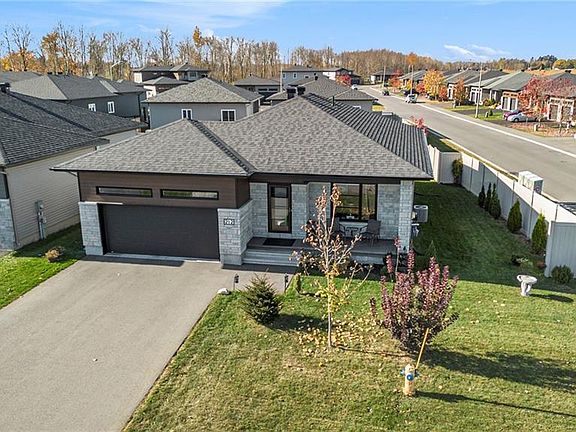 Corner lot bungalow in Embrun boasts a beautiful exterior & is nestled in a quiet, family-oriented neighbourhood. Step inside gleaming hrdwd floors & a open-concept interior for an inviting atmosphere, boasting 9ft ceilings & a gas fireplace. The cozy living room leads into an elegant dining area perfect for gatherings & entertaining. The bright kitchen is equipped w/modern S.S. appliances, ample cabinetry & a sit-at island ideal for casual meals. Patio doors lead to a spacious, partially fenced backyard w/large 3 season covered deck. This home offers 2 bdrms on the main level incl. a luxurious primary suite w/walk-in closet & ensuite bathroom. The large main washroom conveniently includes the home’s laundry facilities. The lower level offers an unspoiled space for a future recreational room, washroom & 2 more bdrms. This home features a fully finished & insulated double car garage & is walking distance to the New York fitness trail, nearby shops & parks.