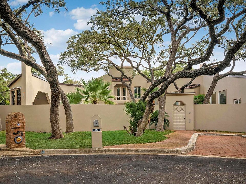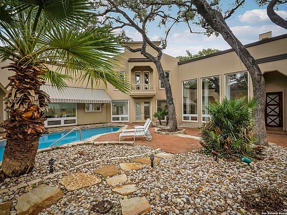 Spectacular custom built home. Stucco exterior, metal roof, soft contemporary home. Open floorplan. Stainless steel double fireplace. Walk behind wet bar with wine closet. Primary bedroom has two oversized closets and one large shoe closet. Room with Sauna. Built in Coyote Grill. Breakfast and kitchen overlook pool and outdoor living. Majestic oak trees. Walled in private residence. Pool and spa is heated. Dramatic floor to ceiling windows. Honed travertine in primary bath. All updated floors, paint, landscaping, bathrooms. appliances and plumbing hardware. This one will not last long.
