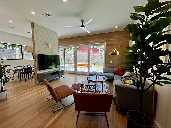 Additionally, in the main house you will find a chefs kitchen completely outfitted for cooking. 36" gas cooktop, double oven, oversized sink, with waterfall quartz countertops, this kitchen is a show stopper. An airy dining room with 8 person table, a living room with custom furniture, a 65" roku smart tv, and a 16' sliding door that overlooks the back yard. On the first floor you will also find a large laundry room with built in cabinetry and mop sink.