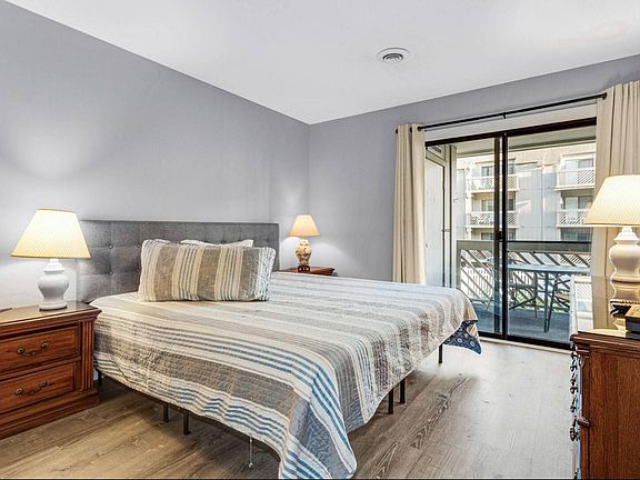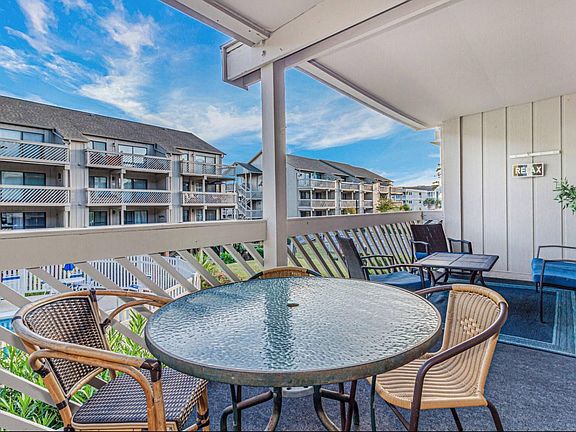 2 bedroom and 2 bath beach home with a nicely equipped kitchen, washer/dryer and is located on the first floor (must climb one set of steps). King bed, single bunk beds, full bed and pull out sofa bed, sleeping a total of 8 (5-6 comfortably). The community is a short one block from the ocean, very quick access to the beach. Spacious 840 square feet with a deep balcony that runs across the entire width of the unit, accessible from the LR and from the main bdrm.. The balcony overlooks the courtyard that includes an outdoor pool, a hot tub, an indoor heated pool, and grills for guests to use. The heated pool is an especially wonderful attraction for guests that visit during the winter months. There are beach toys, beach chairs, and a wagon available to use for the short, one block trip to the beach.