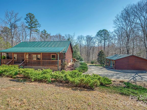 Clearwater Creek is a log home community located in the foothills of Western NC. It is gated and has a community park. In just a few minutes, you can access grocery stores, medical facilities, recreation, walking trails and much more. The lots are all large and this one is 2.78 acres with a CREEK at the back and is surrounded by trees for a private setting. The home is a 3 bedroom , 2 bath log home featuring covered front and back porches, a detached double garage and a 576 square foot studio that can be used as a guest house, recreation or hobby. The driveway is concrete. There is a new generator present in case of any power outage. The house, garage and studio all have new metal roofs and the HVAC unit was replaced in 2023. The interior of the house has wood floors and a gas log fireplace. The kitchen is open to the family room and has all the appliances. The large island with granite tops and rock finish is the focal point and a true gathering place.