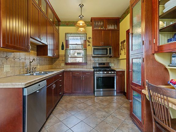 Beautiful plaque home built in 1885.. Original hardwood floors which have been wonderfully maintained.. Entrance features Original curved staircase. 10" ceilings, crown moldings, french doors.. The living room has a brick fireplace with decorative mantel 10 " built in china cabinet and a wonderful view of the fox river. The dining room is unique with original beamed ceilings and wall trim.. and also 10" ceilings..A sun drenched sun room is featured off the dining room.Kitchen has a breakfast bar with glass cabinets and a ceramic tiled floor..Upstairs you have 3 bedrooms.. Master has a private bath with walk in shower and ceramic tile floors and walls.. Third bedroom features an attached bonus room and 4 closets.. Basement has brick stone and tile walls.. Dry bar. great for entertaining..and new water heater Also featured in the basement is a Safe frame and door which is said to have been featured in a room in Chicago where Al Capone stayed... This home is truly beautiful...