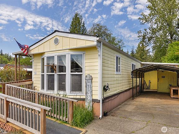 Nicely Updated & Well maintained Single Wide Mfg Home in 55+ park located in picturesque Sultan. Furnace with heat pump updated within last few years ago, Roof is 5-year-old, Handicapped ramp updated last year. Workshop area, detached carport and large closed in front & back porchs adds ample space. Nicely updated bathroom with two access points and large shower with glass doors. Secured mailbox for in and outgoing mail. Wonderful fenced & landscaped yard with raised flower beds. Updated double-pane windows throughout. Space rent - $900/mo. Don't miss this great opportunity!