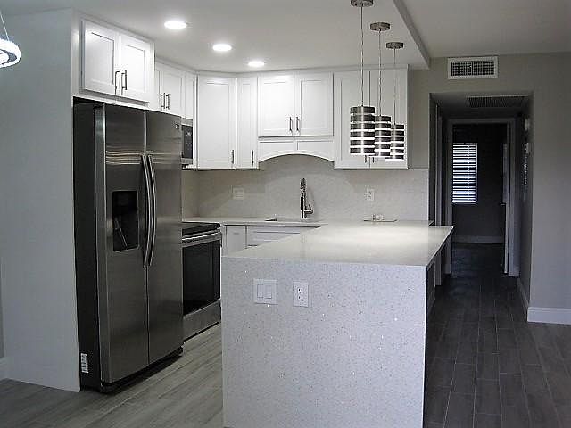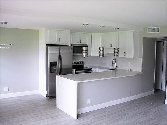 Must see beautiful renovated first floor 2 bed 1 1/2 bath w/ lake view from patio. Dramatic, stunning design features thru/out. Exquisite lighting, Kit stunningly remodeled w/ loads of natural light, seated breakfast bar, custom cabinets, quartz back splash and counter tops, stainless-steel appliances, ample counter space & storage, gorgeous ceramic (wood looking) tile thru/out . Popcorn ceiling removed, new modern baths & shower. Active 55+ community w/ tons of amenities & clubhouse, Olympic size indoor heated pool, professional exercise center, luxury theater, movies, billiards, shuffle board, classes, free bus transportation, sauna, outdoor pool, near shopping, beaches and entertainment.