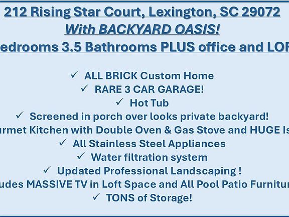 Welcome to this stunning 5-bedroom, all-brick custom-built home featuring the primary suite on the main level and a true backyard oasis! Enjoy ultimate privacy while relaxing by the pool, soaking in the hot tub, or unwinding in the screened-in porch. See yourself grilling out on the large pool deck while entertaining family and friends. Hand-scraped custom hardwood floors greet you at the entrance, leading past an office (or formal sitting room) into an open floor plan designed for entertaining. The gourmet kitchen boasts a massive center island, double ovens, gas cooktop, stainless steel appliances, and an abundance of cabinet space. The primary suite is a spa-like retreat, a towering custom ceiling, complete with a HUGE walk-in closet, separate shower, private water closet, and a garden soaking tub—perfect for relaxing after a long day. Upstairs, you’ll find four additional bedrooms with two Jack-and-Jill bathrooms, plus a large loft complete with a huge TV that conveys—ideal as a teen suite or theatre room. Convenience is key with the upstairs laundry room located near the bedrooms. The updated custom professional landscaping of this home welcomes you with a rare 3-car garage that provides plenty of storage, PLUS plenty of storage throughout this magnificent home. Zoned for award-winning Lexington One schools, including River Bluff High School, this home truly has it all! Disclaimer: CMLS has not reviewed and, therefore, does not endorse vendors who may appear in listings.