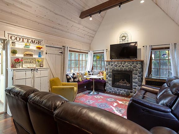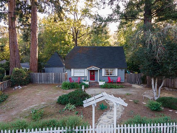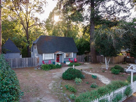 Welcome home to your dream storybook cottage, in the peaceful tree-lined Riverside neighborhood. This mountain getaway home was built in 1922 for the famous wine-making Wente Family, & the tasteful updates hold true to the home's vintage feel. Tucked behind a white picket fence the nearly half-acre property is flat and sunny overlooking the river. The thoughtfully designed interior offers comfort and classic charm, inside & out. Soaring ceiling, cozy fireplace & original hardwood flooring throughout. The living room flows to the cheerful kitchen. The primary bedroom downstairs includes an updated ensuite bathroom, with a custom tiled shower, rain showerhead & frameless glass doors. The backyard studio is perfect for hosting guests. Enjoy outdoor living in the private backyard including a hot tub, situated under redwood trees with a view of the river. Walkable to the main stretch of restaurants, shops, and the Ben Lomond Market. Truly a one-of-a-kind location in Ben Lomond!