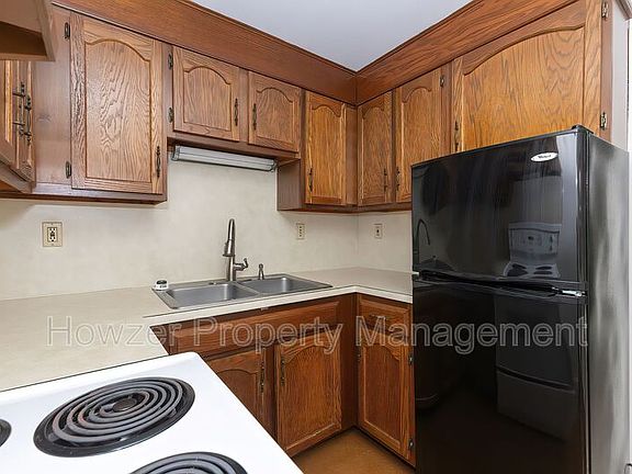 - Kitchen with ample cabinetry, full-size fridge, and electric range