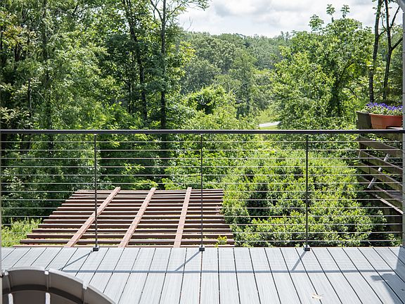 - Large sliding glass doors extend the space outdoors, opening to the deck and surrounding greenery, reinforcing the feeling of being tucked into nature while remaining close to the city.