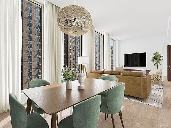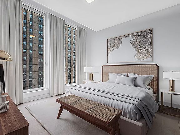 Residence 8A is a light-filled and elegantly designed 828 SF Large corner 1-bedroom home with bright North and East exposures and ceiling heights up to 10'8". The home features 10 oversized floor-to-ceiling, energy-efficient windows clad in white oak with motorized Shade Store blinds, wide-plank oak floors, and a state-of-the-art LG zoned temperature control system.