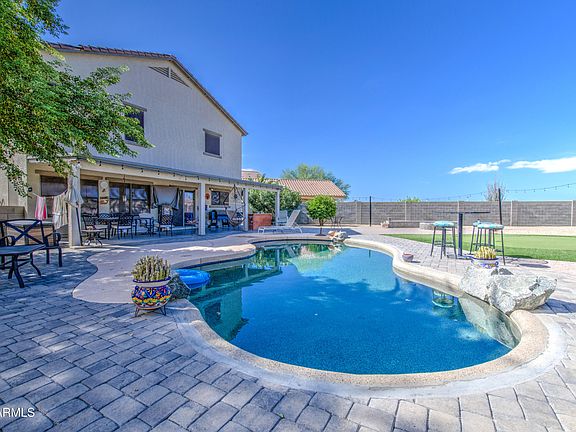 This beautiful 5 bedroom, 2.5 bath home is located on a 12,901 sqft lot. With no neighbors behind this home is great for entertaining, putting green, pool, firepit, spa, and room to add your own touch! Upon entry you'll notice the beautiful wood look tile flooring and wainscoting in the living room! This home offers a first floor guest bedroom, loft with storage closet. The kitchen includes, granite counter, stainless steel appliances, Island, white cabinets with a beautiful tile backsplash to bring the space together. When entertaining friends and family, be sure to take advantage of the full length back patio, and well lit backyard packed with year round activities!