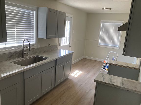 New flooring, kitchen cabinets, counter, stove