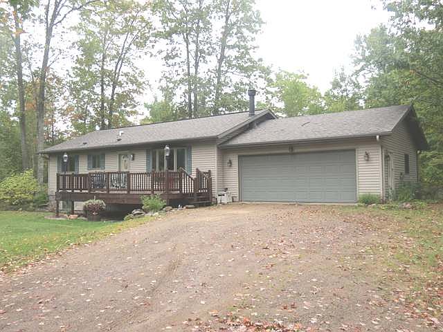 Newer Country home featuring 3 bedrooms, 2 baths on a 3.81 acre wooded lot midway between Rhinelander and Tomahawk. The main floor features a large kitchen and dining area with a patio door leading to a huge backyard deck, living room with fireplace, master bedroom, 2 additional bedrooms, 2 full baths and main floor laundry. The lower level consists of a family room, utility area and extra storage. Additional amenities include a 2 car attached garage, a storage shed and a playhouse.