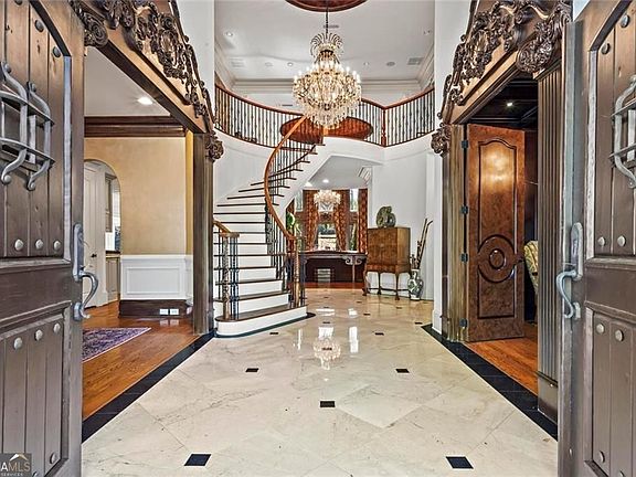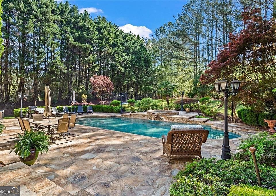 Spectacular brick custom-built estate in the gated Northshore of Windward on the Golf Club of Georgia "Lakeside" course ** Dramatic grand entry with curved staircase and shimmering chandelier * Elegant interiors with hardwood flooring throughout and extensive crown molding * Resort-style outdoor living with swimming pool, spa, waterfall, stone patio, private lawn, and full bath access * Two-story formal living room, banquet-sized dining room, and paneled study with custom chandeliers * Inviting family room with stone two-sided fireplace * Chef's gourmet kitchen with granite counters-one of three full kitchens (main, prep, and terrace level) * Cozy sunroom with views of the pool and stone patio * Owner's retreat on main level with fireplace, built-ins, waterfall pool views, and luxurious bath * Double vanities, walk-in closet, water closet with bidet, and private access to paneled study * Four secondary bedrooms upstairs, each with private baths and custom walk-in closets * *Terrace level entertainer's dream: Full double-island granite kitchen Home theater Mirrored exercise room Steam shower & sauna Guest suite with private bath Travertine flooring ** Located in Northshore of Windward, featuring its own clubhouse, sport court, pool, and tennis courts Part of Windward's 3,400-acre master-planned community with: 195-acre Lake Windward for fishing, canoeing, and sailing Optional membership at Windward Lake Club with tennis center, pools, and marina Golf Club of Georgia with two private 18-hole championship courses