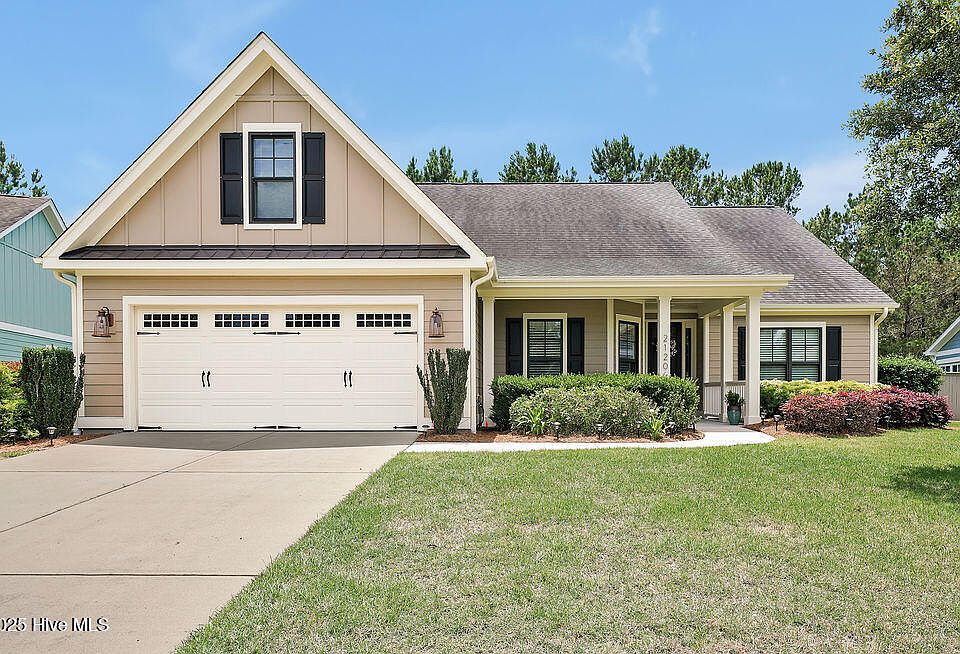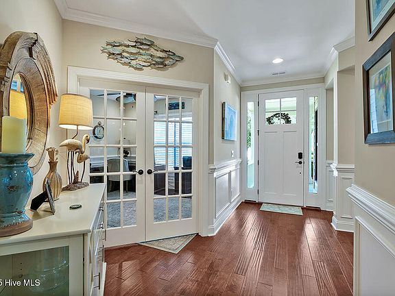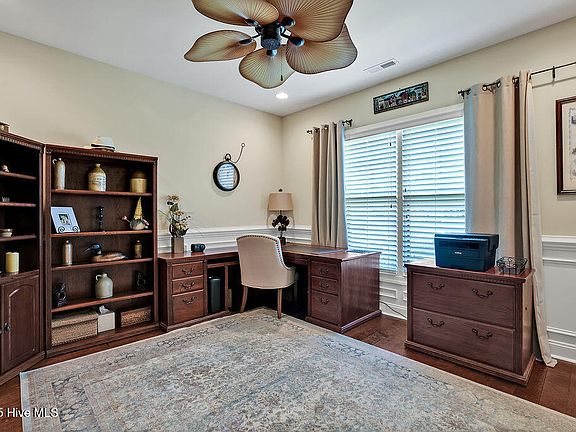 Located in the Park Landing neighborhood of Brunswick Forest, this is the Blue Heron I model by Jordan Built Homes. This home offers 3 bedrooms, 2.5 bathrooms, a screen porch, and a dedicated office - all on one level. Hardwood floors grace the main living areas, and natural gas is utilized for energy efficiency. Keyless entry opens the craftsman style front door with sidelight windows, and brings you into the foyer with box-style wainscoting and chair rail molding, and a coat closet with wood shelving & hanging bar. French doors open into the elegant office. The kitchen is enhanced with granite countertops, a glass door cabinet, a built-in wine rack, and natural gas cooking. A large island with a quartz antique limestone counter is perfect for entertaining. The breakfast area leads you to the welcoming screen porch with Eze-breeze windows, shades, and a ceiling fan. Highlights of the primary suite include a tranquil view of the well-manicured backyard, as well as trey ceiling, walk-in shower, separate tub, double vanity, and oversized walk-in closet. Jack & Jill bedrooms share a guest bathroom, and a powder room is available for all who stop by. Time outside will be enjoyed by all with the paver patio with a built-in natural gas fire pit and stacked stone seating. The exterior of the home was painted in 2025. HOA fees for this neighborhood include landscape maintenance and community amenities. Features of Brunswick Forest include three outdoor pools, one indoor pool, a hot tub, a Fitness & Wellness Center, two cardio/weight rooms, tennis courts, basketball and pickleball courts, Hammock Lake, miles of walking trails, parks, a playground, a dog park, and meeting rooms. The Villages of Brunswick Forest is a commercial area with restaurants, shopping, and medical facilities. Only a short ride to Historic Downtown Wilmington, New Hanover County/Brunswick County Beaches.