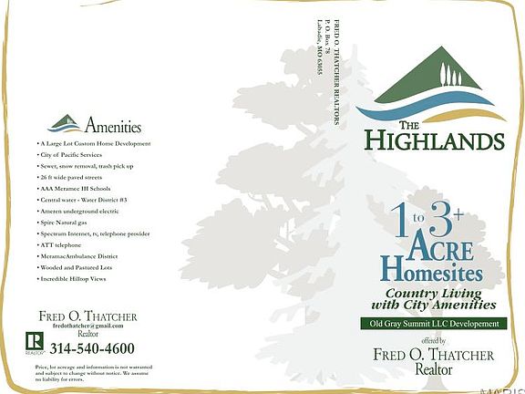 THE HIGHLANDS is Franklin Counties Latest and Finest 1-3+ acre Custom Home 20 Lot Development . Truly an enclave with few neighbors. You may choose from a variety of Open & Wooded lots all with mostly level building sites and gently sloping rear yards, perfect for rear walk out some overlooking common ground, lake, and or woods. Enjoy a Country atmosphere with ALL underground city services ,Sewer, water, telephone, Electric, Spectrum Internet, Spire Natural gas ,Incredible endless Hilltop views, wide paved streets maintained by the HOA, Protective Covenants with an emphasis on quality and style.Your builder of choice with no time frame to build.