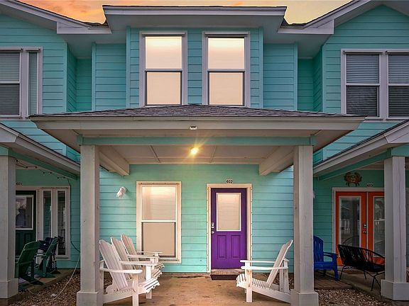 Escape to coastal paradise with this inviting townhouse at The Commons in Port Aransas! Unit 602 is a 3-bedroom, 2 1/2-bath retreat with a cool beachy vibe. Located on 11th St between Ave G and Access Rd 1A. The Commons is constructed of Insulated Concrete Forms (ICF). This has proven to be one of the most durable construction methods yet devised. See the links in supplements for more information on this type of construction. The open-concept layout on the lower level seamlessly connects the kitchen, living, and dining areas, perfect for entertaining. A convenient 1/2 bath adds to the functionality of the main floor. Upstairs is a queen primary bedroom with private bath. Also, upstairs there is a bathroom, laundry closet, a secondary queen bedroom and a bunk room with full-size beds. A highlight is the shady afternoon patio, offering the perfect spot to relax after a day of beach adventures. The community pool is just steps away. Zoned for STR and sold fully furnished!