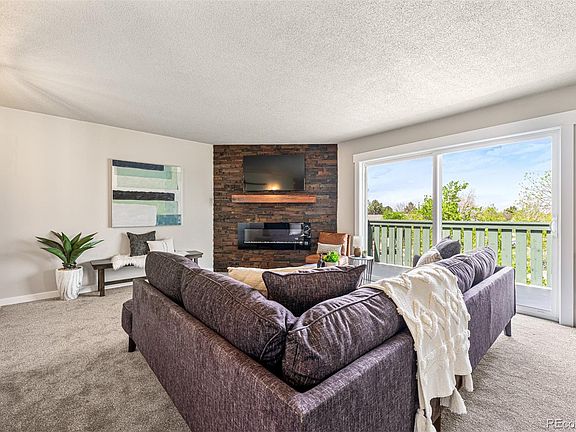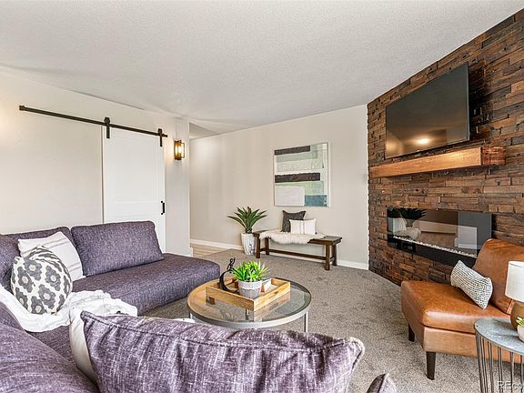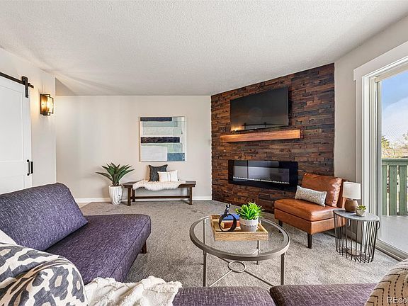 Completely remodeled two-bedroom, two-bath condo at Brookshire Downs within the Heather Ridge neighborhood and Cherry Creek School District. Everything is brand new inside this 1,068 square-foot penthouse flat. You'll fall in love with the updated kitchen featuring Shaker cabinets in a gorgeous blue, along with quartz counters, peninsula bar, stainless appliances and recessed lighting, plus modern hardware and fixtures. The adjoining open living room is large enough for a sectional and big dining room table. Making this space cozy and comfortable yet bright and fresh is a custom barnwood fireplace wall, included Samsung TV, expanded storage closet with barn door, and oversized glass slider out to your private balcony where you can enjoy your morning coffee and views of the community greenbelt. Your primary suite has been redesigned to include a spacious walk-in closet and a convenient, brand-new washer and dryer. Two parking spaces, one covered, and low HOA dues. Turnkey and fabulous!