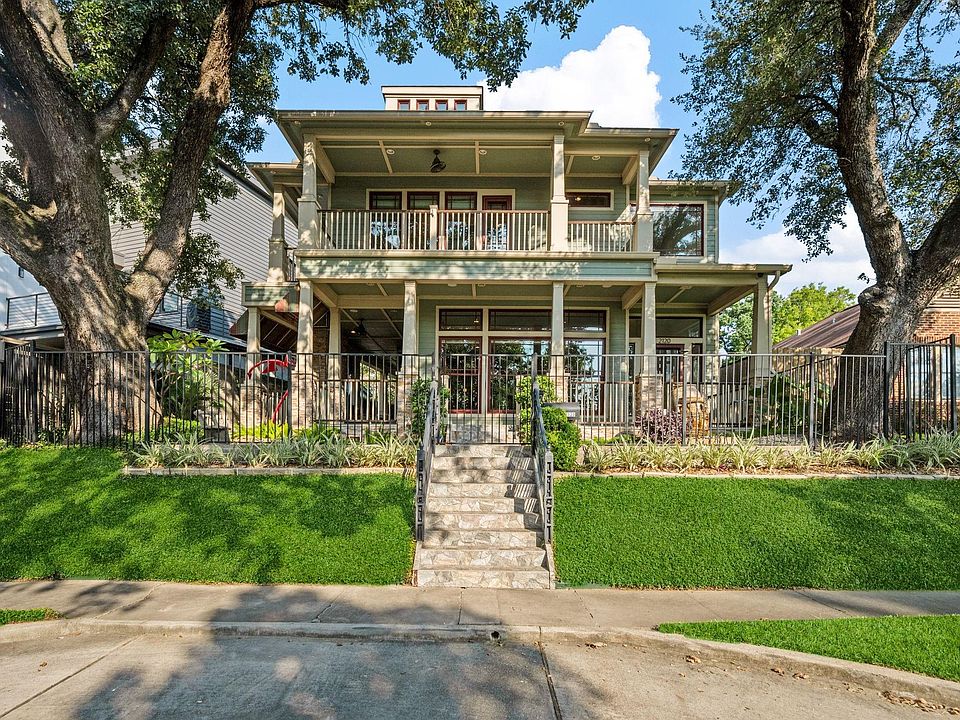 Tucked beside the White Oak Hike & Bike Trail, this urban retreat offers comfort and convenience. A circular front drive, rear alley access, and whole home generator provide peace of mind. The covered front/side porch with built-in outdoor kitchen is perfect for entertaining. Surrounded by mature trees, the home feels like a private treehouse filled with natural light. The large living room, dramatic dining room, and open kitchen create an ideal space for memorable gatherings. Upstairs, the spacious primary suite features a private balcony, generous bath, and dual walk-in closets. A flexible den offers space for a home office, media room, or playroom. Prime location—just minutes from downtown, restaurants, and entertainment.