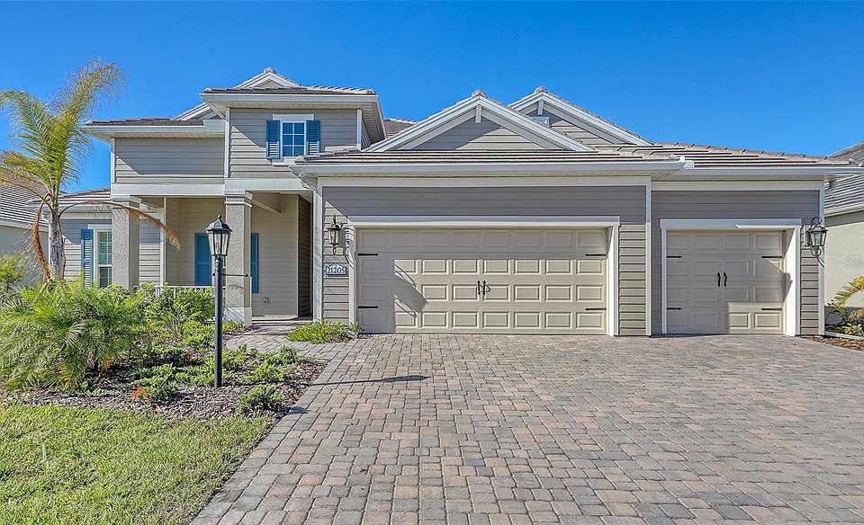 Grand Palm is a resort style, amenity rich, natural gas community located minutes to charming Downtown Venice, beautiful beaches, Wellen Park downtown and Hwy 75. This spacious, open Kiawah has styligh wood-look tile throughout the home. With 8' Interior doors and 10' ceilings featuring coffered ceilings in the great room & master, heighten the grander. Upgraded kitchen, light cabinets and quartz counter tops, large island. The master has large walk-in closet and walk in shower. The pool bath is conveniently located near 4th bedroom. Pocket sliding glass doors open onto a large covered lanai, complimented by the private pool and spa. Impact windows and smart home features give you peace of mind. Lawn maintenance and community amenities are included in the low HOA.