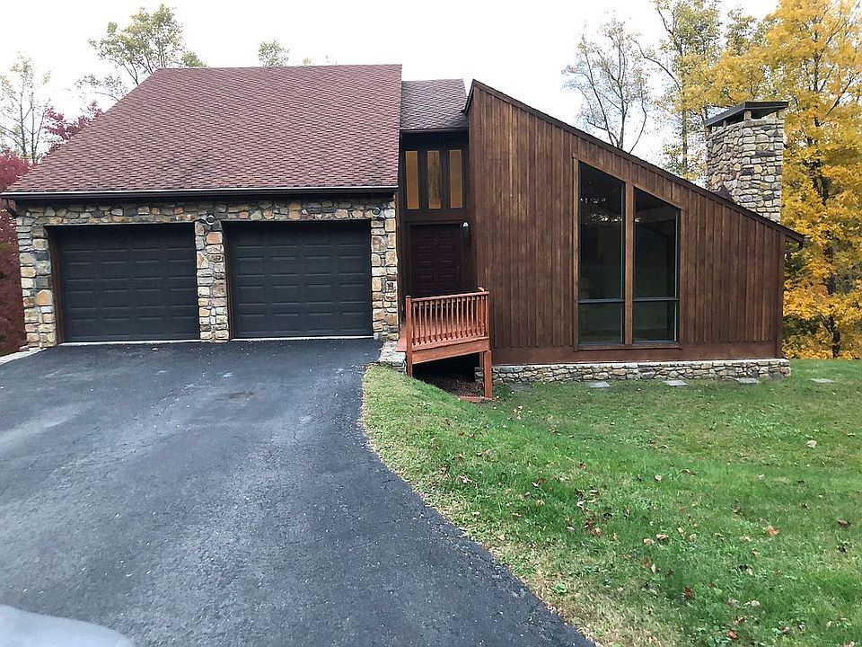 Rustic brown cedar siding split-level house at 2121 Airport Road Vansant VA. The chimney is covered in stone as well as stone around bottom of the house plus columns between garage doors. Located 2 miles from the new Southern Gap High School currently under construction. House sits on 3 acres of land surrounded by beautiful mountain views, sunrises and sunsets. Upper level of house is approximately 1,500 square feet plus 1,000 square feet for bottom level – total 2,500 feet living space plus 500 feet attached garage. Includes 3 bedrooms and 3 bathrooms plus living room, dining room, kitchen, laundry room and den. Front entrance of the house has a spacious 4 feet wood front door with green marble tile in the foyer. 15 feet ceilings with 3 windows over the front door and large light fixture. Living room has partial hardwood and carpet plus 18 to 20 feet cedar ceilings with a warm rich wood grain finish. One side wall in the living room is completely stone with fireplace in the center. Mantle custom fitted on the stone wall that was originally a wood beam from my grandfather’s home place that shows the actual axe marks from roughly over eighty years ago. Beautiful stained railing offsets the step down into the living room. Foyer, living room and dining room all visual from entrance into the house with large windows in the living room to showcase lots of natural light. Master bedroom also has 15 feet vaulted ceilings on one side. Carpet throughout the bedroom with spacious walk in closet and sturdy shelfing for storage. Master bath includes jets in the tub, plus tile floors and all around the tub. Tile floor in the kitchen plus matching tile under the cabinets. Counter tops are white formica with customer build cabinets in natural wood grain. Window seat with additional storage underneath plus 2 large windows with good lighting and great views of back of the house. Appliances include refrigerator (18 months old), oven, cooktop and dishwasher. Also garage disposal and trash compactor. Cooktop sits in center of large island with extra storage underneath. Hood range overhead. Nice size pantry with long shelves. Small tiled bathroom off from the kitchen with shower. Laundry room with overhead cabinets for storage and washer and dry included plus small utility sink. Stairs going down to the bottom level are all hardwood and railing is stained to match. Small landing between the stairs is hardwood with more windows letting in natural light. Overhead ski light at top of stairs as well. All hardwood large den with ceiling fans plus side bar with small refrigerator and sink. Bar has a white marble top. Two nice size bedrooms with closets – all carpet. Downstairs bathroom with double sink vanity and tile flooring. Small room with hot water heater plus shelving for storage. Small storage under the stairway as well. Includes 500 feet concrete floor garage with some counter shelving.