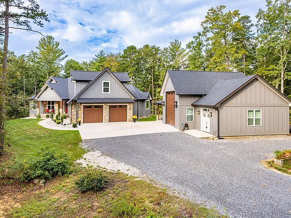 A rare find - mountain living at its best! Solitude and privacy upon 6.80 acres. Quality custom built. Newer (2022) construction. Luxurious primary suite on the main level. Features luxurious primary bath, his & her vanities, garden tub, tile floors, custom shower with dual shower heads w/converter valve, toilet closet and walk-in closets. Split floor plan consisting of bedroom #2 with full bath #2 and bedroom #3 with full bath #3 also all on the main level. Open floor plan includes a separate dining room, family room with cathedral ceilings and mountain stone fireplace (gas logs). Engineered hardwood floors, gourmet kitchen features large pantry closet with wet bar, refrigerator, coffee bar with wine cooler. Split oven (half or full size). Stainless steel appliances. Island with designer sink and solid surface countertops. Eat-in kitchen features one side serving bar near the family room and another serving bar next to the built-in pantry with pull out drawers and mixer shelves. Also, office/study/bedroom (#4) on the main level. Private guest suite upstairs (bedroom #5) includes kitchenette w/sink, refrigerator and full bathroom. Custom 2 panel doors throughout. Low maintenance exterior with mountain stone, fiber cement and vinyl siding. Screened porch with tongue and groove ceiling. 15' x 8' swim spa with 5ft deep end. TimberTech decking. Custom built RV garage includes 30 amp service and sewer hookup, 30ft x 20ft includes heated floors, separate workshop with mini split heat and air and full bath (#5). Also, includes a bonus room for storage or studio. Crawl space w/dehumidifier w/interior humidistat. This custom show place is impeccable. Too many features to mention. Must see to appreciate.