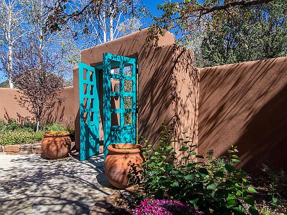 NEW!! Casa de Enchantment with Panoramic Sunset Views - 3 Bedrooms 4 Baths Located in the Santa Fe foothills with Panoramic Sunset Views, 3 king bedrooms en-suite baths, 1.3 acres, fenced dog park, 2 car garage, Central A/C, radiant heat, patios and decks, full of light, and 4 fireplaces! NEW INTRODUCTORY PRICE - $9500 MONTHLY! Casa de Enchantment's captivating panoramic sunset views, the privacy of 1.3 wooded acres, a spacious 3200 sq. ft interior, an enclosed dog park, and only a 10-minute ride from Downtown Santa Fe - Look no further! This will accommodate all your loved ones! There is even additional parking for your get togethers! This professionally decorated split level home sits on over an acre of wooded privacy, completely fenced & landscaped in the foothills of the Sangre de Cristo Mountains, custom built & architecturally unique home feels incredibly secluded even though it is within easy reach of Santa Fe's epicenter, Canyon Road, and Museum Hill. The home's soft contemporary aesthetic strikes a perfect balance with high, dramatic wood beamed ceilings, diamond plaster walls, Italian tile floors and custom doors, sprinkled throughout with the Santa Fe charm we all love. A light & bright living room is wrapped on three sides with tall windows and flows seamlessly into the dining room. A spacious kitchen is complete with custom cabinetry, new Kitchen Aid stainless steel appliances including gas stove and wine cooler, granite countertops, skylights and even its own fireplace! The king master suite comes complete with its own viewing deck, fireplace, jacuzzi tub plus walk-in shower, and an exceptionally large closet plus another bath with vanity and walk-in shower. The other two king en-suite bath bedrooms are privately located with separate entrances. The lower level California king bedroom is always made up as a king bed even though it is 2 California twin beds. The king bed can be converted to two twins at an additional fee of $75.00. The bonus office with built-in desk and shelving is located in the master suite.. The light from dozens of windows throughout this property create views that can be enjoyed from nearly every corner of the house. Multiple flagstone portals, patios and decks outside, 4 fireplace, laundry, and 2 car garage round out this wonderful property. Approximately 3200 sq. ft.
