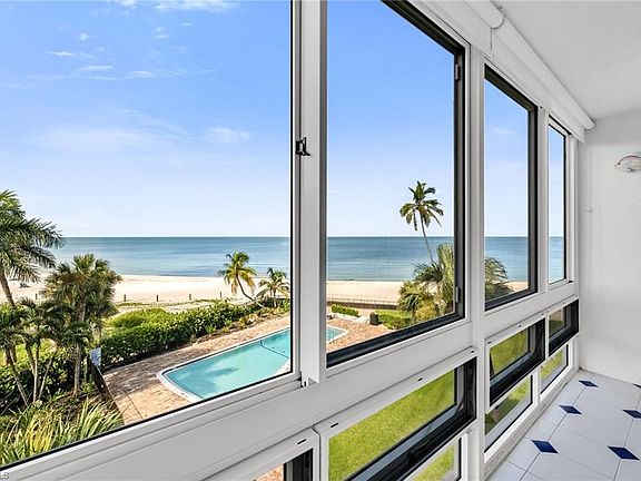Indulge in the ultimate beachfront lifestyle in this ideally situated 2 bedroom, 2 bath unit, perfectly positioned on the Gulf of Mexico in the coveted Moorings Beach enclave. With direct, panoramic views of sugar white sands and turquoise waters, this residence is a coastal gem offering direct beachfront access to one of the most open stretches of beach along Gulf Shore Blvd. Wall-to-wall, floor-to-ceiling sliders in the living room that open to a wide sunroom, offering seamless indoor-outdoor living and unobstructed Gulf views. The living and dining spaces feature a neutral, elegant palette, accentuated by coastal finishes and abundant natural light. The kitchen is white, bright and fully functional with ample storage and an easy flow making it ideal for preparing your beach walk morning coffee or a full meal! Primary suite is a serene retreat: offering direct Gulf views and a comfortably appointed en-suite bath. Lovely guest bedroom is generous in size, with large windows and close access to the second bath (which also serves as a powder bath for guests).Throughout the unit, tasteful coastal décor—such as light tile floors, creamy carpeting, and neutral paint enhance and emphasize this ideal beachfront setting. Royal Palm Club is a welcoming community offering private access to the beach which means your days begin with gentle surf and end with spectacular sunsets. Gulf-front pool and sundeck allow you to unwind steps from your door, with uninterrupted views of the Gulf. Covered and assigned parking plus individual storage and an immaculate common laundry ensure your convenience and security. Professionally managed, well maintained building with a responsive board and an onsite property manager reflects pride of ownership. RPC also offers an unbeatable Location: from your doorstep, you’re minutes away from: Venetian Village's boutique shops and waterfront restaurants, 5th Avenue South & Third Street South with upscale dining, galleries, and nightlife, World-class golf courses, pristine parks, and cultural venues. Easily accessible to both Naples Airport and Southwest Florida International Airport (RSW)