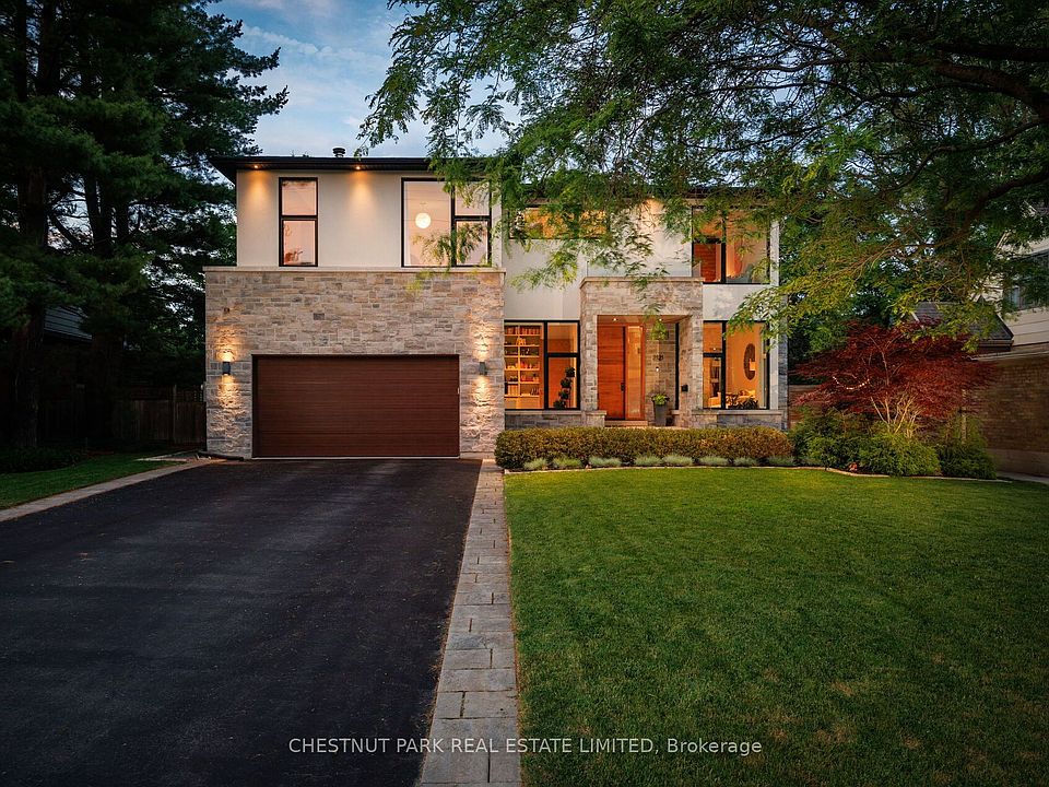 Discover the essence of timelessly designed contemporary living at 2121 Harvest Dr: a marvel that blends sophistication & modern comfort, nestled on a quiet street within South Mississauga's coveted Applewood Acres. This luxurious 2-storey, 4+1-bed, 5-bath contemporary, sun-drenched home, custom-built in 2016, features just about 5,000 sq ft of total indoor living space on 3 levels & beautifully designed landscaped exteriors with a covered rear deck. It utilizes its remarkable scale to balance family life with space & features for unparalleled entertainment. Every inch of this spacious home is usable for quiet retreat & leisure while merging quality workmanship with clever design - the home's main level features soaring 10-ft ceilings, floor-to-ceiling windows that flood the space with natural light, white oak hardwood floors, solid wood doors, dramatic fireplaces & premium custom built-in walnut finishes throughout. The home's 2nd level features 4 bedrooms & 3 serene, spa-inspired bathrooms. The primary bedroom features a dramatic double-sided gas fireplace, creating a calm, focused space in which to start or end the day. The primary also features a 5-piece ensuite with double sinks & quartz vanities, a standalone soaker tub, & an oversized glass walk-in shower. The primary has the perfect walk-in wardrobe room with floor-to-ceiling, wall-to-wall, his-and-hers, custom walnut cabinetry. Retreat downstairs to the lower level, featuring wide windows for natural light, in-floor heating & white oak hardwood flooring. The lower level includes a spacious media room with custom-built-in walnut cabinetry, built-in speakers, & a designer gas fireplace. Also included is a well-proportioned bedroom with an adjacent 3-piece bathroom. Another unique feature is the sound-treated music studio. The glass-walled gym provides an ideal backdrop in which to be invigorated. After a workout or at the end of a busy day, unwind by the adjacent wet bar with family & friends.