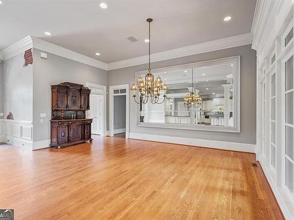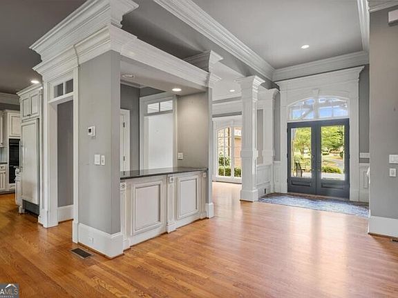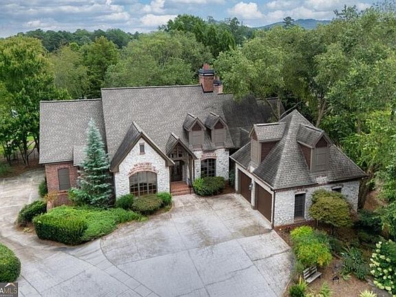 Sunlight streams through the ample oversized windows in this gorgeous European styled ranch on a full finished basement. Set in a curated community of 14 homes, the house sits are the end of the cul-de-sac where the fenced backyard offers privacy. There are beautiful views of a neighboring lake off the two rear covered porches, one with Italian wrought iron railing. The exterior, a mix of stone, brick, and custom wooden arches is charming from front to back. Inside a welcoming brick floored foyer, along with a custom framed mirrored wall dining room, feature 12' ceilings. The open family room, living room, and bedrooms have 10' ceilings. A spacious kitchen has a large Breakfast bar, white cabinets, stone countertops, two walk-in pantries, and desk. The butler's pantry/bar off the kitchen is perfect for entertaining. The inviting family room features a stacked stone fireplace, built in cabinets, and a beautifully appointed wall of windows. A separate formal living room would also serve as a wonderful music room. The primary suite is located on the main level and has access to the rear covered porch. It also features a large en suite primary bathroom with double vanities, soaking tub, separate shower and impressive walk-in closet. A laundry room is conveniently located off the kitchen, as is a covered walkway leading to the 2 car garage. Two additional bedrooms, a full bathroom, and half bath complete the main floor. An open stairwell leads to a terrace level that features a second full kitchen with white cabinets, a second generous family room with brick floor, stacked stone fireplace, and wall of windows, Two bedrooms, both with private bathrooms, two large storage rooms, and the 3rd garage. This is the perfect home for anyone looking for something unique but extremely livable. The gated community is close to Marietta Country Club, Mount Paran and surrounding schools, Barrett Parkway, I-75, area restaurants and shopping!