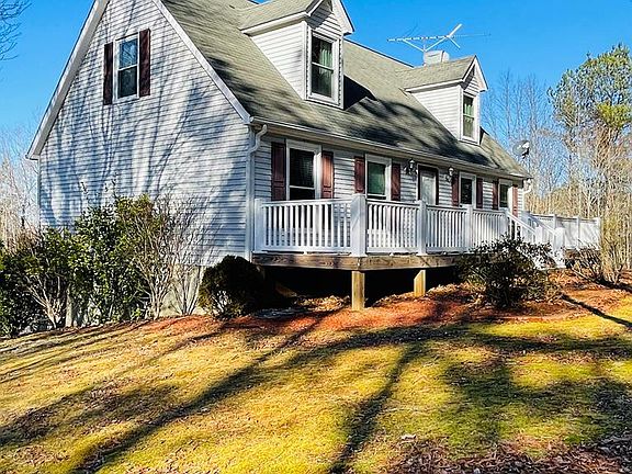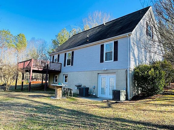 Enjoy a secluded home on 5 AC at the end of a country lane surrounded by a hardwood forest. There's a walkway to the 40' front deck, then enter the living room with open stairway, dining & kitchen with stainless appliances & new flooring. The main level has two bedrooms and full bath. Upstairs are the 3rd &4th bedrooms and 2nd bath. Zoned heat pumps & replacement windows for comfort year round. The full basement is walk out level with French doors. From the entrance the home sets back with plenty of graveled parking, entertainment area & a storage building. The back yard orchard includes apple, pear & cherry trees & white grape vines. Located between South Boston & Danville with easy access to VIR & Hyco Lake.