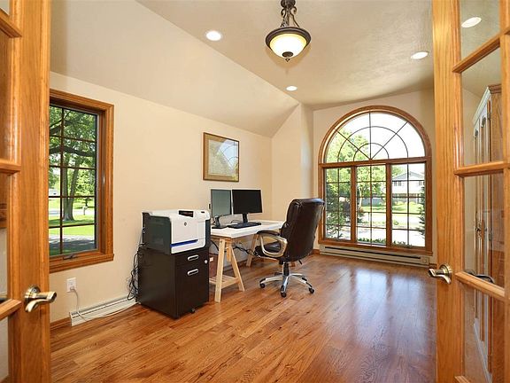 This elegant home provides todays most requested features and countless amenities. Its innovative design provides an abundance of living areas, flexible multi-purpose rooms, and exciting features. From the inviting front porch to the sprawling landscaped acre lot and elevated back deck, this home provides dramatic spaces, luxurious appointments and true flexibility. Just beyond the striking recessed entry lies an open foyer which unfolds to the spacious great room that boasts a cathedral ceiling, and a dramatic floor to ceiling brick wood burning fireplace. Tall architectural windows flood this room with an abundance of light. French doors from the foyer access the office with large windows and volume ceiling. Careful planning creates a spectacular floor plan that is open from the great room to the dining area, kitchen, and sunroom! The openness provides a large space for all your gatherings. The kitchen creates an atmosphere for both cooking and conversation and comes equipped with raised panel cabinetry, granite counters, stainless steel appliances, and breakfast bar. The eat-in dinette is positioned between the great room and kitchen, and is perfect for entertaining or casual dining. The sunroom at the back of the home will sure be the favorite retreat. This cozy space is surrounded by large windows and overlooks the scenic backdrop. Tucked behind the living space you will find the generously sized master. Loaded with amenities this room boats numerous windows, tile walk-in shower, dual vanity, and walk-in closet. A second bedroom on the main level is tucked off the back entry with access to a full bath. This space could be utilized as for an in-home office with access to a private side door entry, returning guest, and/or craft room. The first floor laundry is truly impressive with loads of built-in cabinetry and counter space. An updated convenient third bathroom completes the main level living space. A sweeping staircase leads to the upper level comprising two oversized bedrooms with ample closet space, and a remodeled full bath. Need more space? Enhance your lifestyle with even more room for living and entertaining with the sizable finished lower level. The sprawling family room is lit by a wall of windows that bridges the outdoors in creating an abundance of natural light. Entertain with the wet bar, take an evening dip in the hot tub in the separate lower level solarium, or curl up by the wood burning fireplace. Escape the confines of the house and relax on the back deck or wind down in the luxury of the picturesque backyard with fruit trees. Accommodate all your storage needs with this 1,292 +/- sqft garage with workshop area and stairs to the basement. Exquisite inside and out, the attention to detail is obvious in the quality and craftsmanship of this custom built home!