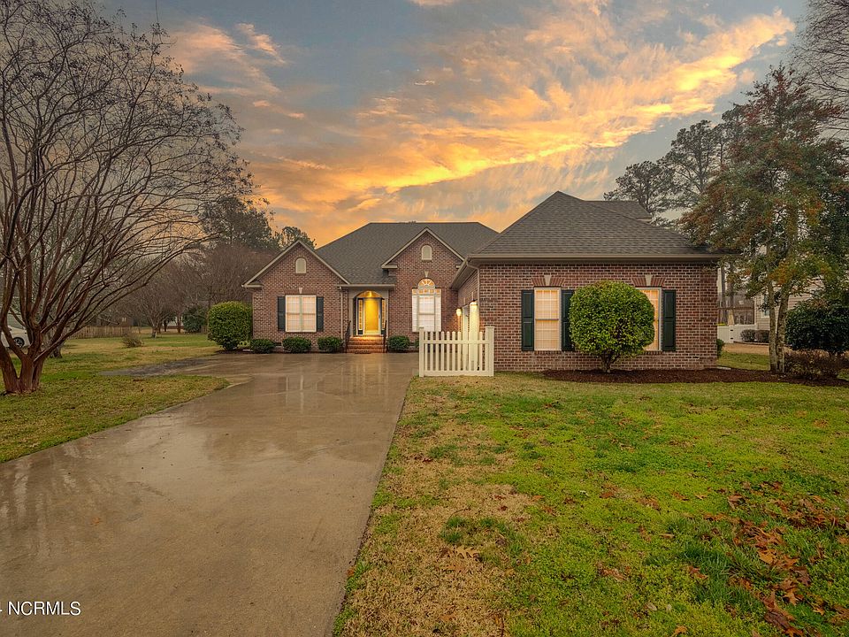 Welcome to a timeless masterpiece nestled amidst a picturesque landscape, where elegance meets comfort in every corner. This stately brick home exudes sophistication and charm, offering a sanctuary of refined living. As you step through the entrance, you are greeted by a formal dining room, perfect for hosting elegant dinner parties and creating cherished memories. The great room beckons with warmth, featuring a fireplace flanked by built-in bookshelves, creating a focal point that exudes both grandeur and coziness. The heart of the home lies within the meticulously designed kitchen, where culinary delights come to life. With a breakfast area bathed in natural light, mornings are sure to start off on the right foot in this inviting space. This home boasts two guest bedrooms, each offering comfort and privacy, and seamlessly connected by a luxurious Jack and Jill bathroom, providing convenience without compromising on style. Retreat to the primary bedroom, where tranquility awaits beneath trey ceilings that add a touch of architectural elegance. The ensuite bathroom is a sanctuary of relaxation, featuring a double bowl vanity, a walk-in closet offering ample storage, and a walk in deep jetted tub, perfect for unwinding after a long day. This home also offers a versatile finished room over the garage (FROG) complete with a closet. This space provides endless possibilities, whether used as a home office, media room, or an additional bedroom. Outside, the allure continues with meticulously landscaped grounds, offering a serene backdrop for outdoor gatherings or moments of quiet contemplation. This Neighborhood offers access to a boat basin on the Pasquotank River.