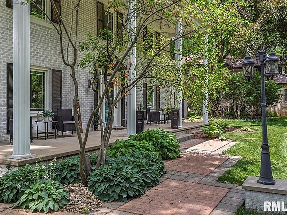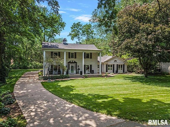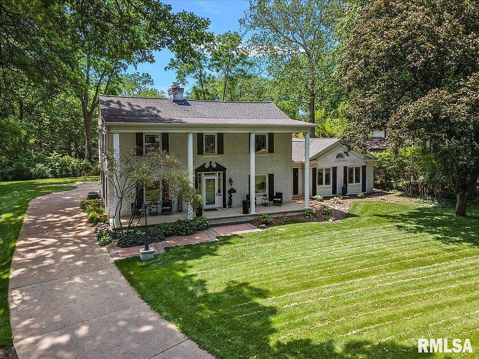 Now priced below a recent independent appraisal! Introducing a stately brick Colonial 2-Story tucked away on one of Leland Grove’s premier streets! Enjoy summer nights conversing on the oversized front porch overlooking a wooded tree line view. This stunning home offers 5 spacious bedrooms, 4.5 bths, and a 4-car climate-controlled att. garage perfect for a workshop. One area of it is currently used as a perfect home office with both French doors, a brick wall and a double slider door. The beautifully redone office/sunroom with heating and air conditioning is filled with natural daylight and built in bookshelves. The formal living room features a cozy gas log F/P & refurbished hardwood flooring by Brookens. The eat-in kitchen has been tastefully remodeled with new flooring, tiled backsplash imported from Italy, a cooks dream stove, island with seating and stainless steel appliances. You’ll love the serene sitting room for reading or the perfect space for enjoying your favorite musician. The elegant main floor primary en-suite features vaulted ceilings with wood beams, rich hardwood flooring, double bowl vanity, tiled shower w/ glass doors, and plenty of closet space. Upstairs you will find 4 more spacious remodeled bedrooms including a second primary en-suite. The roof has been restructured to accommodate a 4x4 skylight. Premium high performance casement windows added. Enjoy pristine landscaping and mature trees from every view.