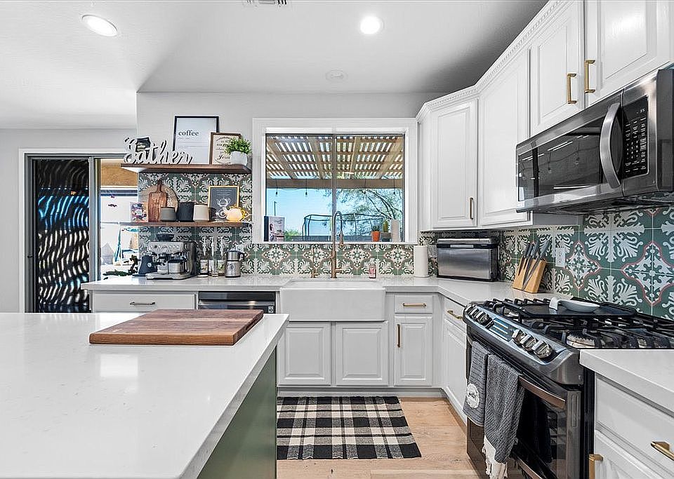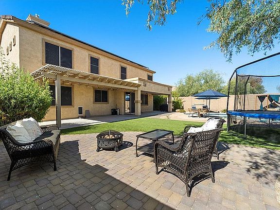 Former model home in conveniently located gated community. Meticulously cared for, this 3,700+ square foot home is adorned with a beautiful fireplace, vaulted ceilings, and brand new upgraded flooring. Totally remodeled kitchen, extended kitchen inland, over size dining room space with new LED recessed lighting, which overlooks the large living room, new appliances, and quartz countertops. The massive bedroom offers an elegant layout, with French doors that open to a separate sitting room/office/gym with mountain views. The upstairs offers a semi-enclosed flex space that could be considered a 5th bedroom. The back yard has a 10,000 gallon entertainer's pool, upgraded backyard oasis with large artificial turf area, and pavers throughout.