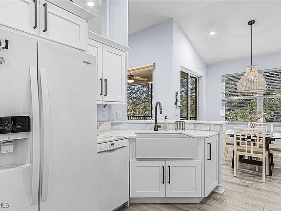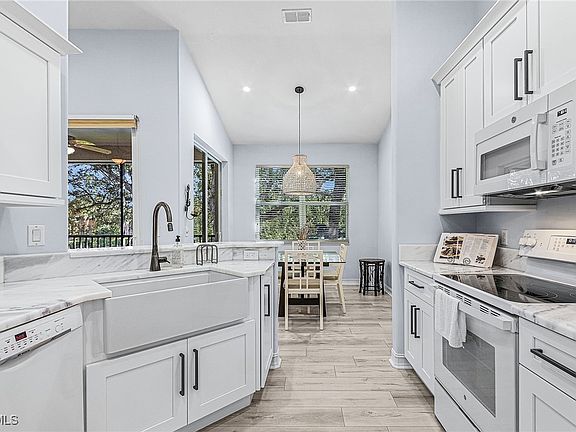 Step into this pristine second-floor coach home in Pelican Sound, one of Southwest Florida's top bundled golf communities. Offered turnkey furnished in a fresh coastal style with stylish accents, this residence boasts stunning views from the lake to the first fairway of the Lakes course. The updated kitchen features sleek quartzite countertops, tall 42-inch white cabinets, crisp white appliances, and convenient pull-out drawers for easy organization. Throughout the main living areas, soaring volume ceilings enhance the sense of space, complemented by durable luxury vinyl plank flooring that runs seamlessly from room to room. Recent upgrades—such as hurricane-resistant windows and sliding doors installed in 2025, refreshed baths, modernized kitchen elements, and new flooring—ensure the entire home feels thoughtfully refreshed and contemporary. Relax in the tranquil primary suite, which includes a tray ceiling, direct lanai access, and a spacious walk-in closet. The fully renovated primary bath offers a long vanity with dual sinks, an updated tiled shower, and a seamless shower door. For guests, a pocket door provides privacy along the hallway to the guest bedroom and its adjacent bath, which has been updated with a new vanity and quartzite countertop. The versatile third bedroom, with double doors, currently serves as a home office or den. Outside, park your car or golf cart in the one-car garage, with additional pads for two more vehicles and nearby guest parking. Access your private entrance via a dedicated stairwell, and enjoy the bright east-facing exposure that fills the space with morning light. Conveniently located near the Corkscrew Road gate, this lightly used vacation condo remains in exceptional condition—simply unpack and settle in! For an active lifestyle, Pelican Sound offers 27 holes of championship golf, 14 pickleball courts, 8 tennis courts, and 6 bocce areas, plus a state-of-the-art fitness center with professional staff. Bordering the Estero River with Gulf access, the community provides secure dry boat storage, kayaks, canoes, and paddleboards. A standout feature is the shuttle service—a scenic pontoon boat ride through Estero Bay to Lovers Key State Park Beach, perfect for spotting wildlife and soaking in breathtaking views. Residents also enjoy the clubhouse with exceptional dining options right in the neighborhood, so you never need to venture far for a memorable meal. Just moments from RSW International Airport, Coconut Point, and an array of shopping and restaurants, this is the ultimate spot to live the Florida dream!