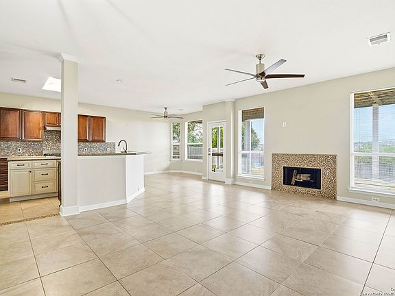 Move-in-ready two-story home with sweeping hill country views in the gated Encino Rio community. Zoned to top-rated North East ISD schools, including Encino Park Elementary within the neighborhood, Tejada Middle within walking distance, and Johnson High. This 5-bedroom, 3 bath home offers over 2,500 sq ft of well-designed living space with a home office, upstairs game room, and a spacious open layout. Classic brick exterior, mature landscaping, and a towering shade tree create welcoming curb appeal. Inside, tall ceilings, abundant natural light, modern ceiling fans, and neutral finishes highlight beautifully maintained tile and wood-look flooring throughout-no carpet. The kitchen features granite countertops, a center island, stainless steel appliances, decorative tile backsplash, and generous cabinet space. Wraparound bar seating connects seamlessly to the living and dining areas for easy entertaining. The traditional formal dining room has added glass doors for use as an office or private flex space. A full secondary bath and laundry room complete the level. Upstairs, the large primary suite includes dual vanities and a walk-in closet. A second living area separates the primary from four additional bedrooms and 3rd full bath. Outdoor living includes a covered second-floor balcony and a shaded patio below-both perfect for enjoying the long-distance views. The fenced backyard offers plenty of room for play, pets, and gardening, plus a storage shed. Encino Rio residents enjoy a community pool, park, playground, and sports court. Nearby are HEB Plus, several restaurants, and Canyon Springs Golf Club, with easy access to major shopping, medical centers, and Hwy 281-just 25 minutes to downtown. Don't miss out on this prime opportunity to secure a home in this coveted community - schedule a showing today!