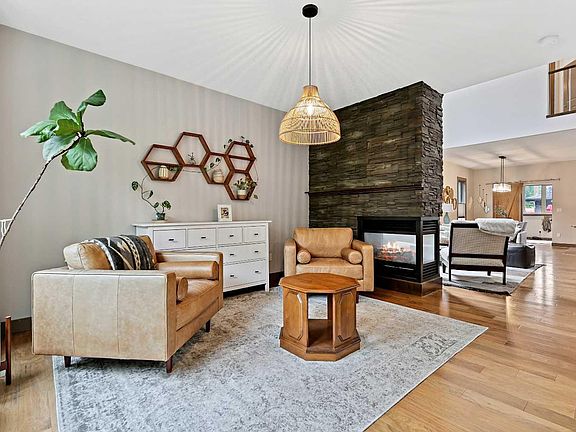 Bright open-concept floor planGleaming hardwood floorsElegant wrought iron railingsSoaring vaulted ceilingsChef-inspired kitchenGranite countertopsStylish tile backsplash