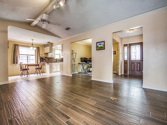 Charming 3 bedroom 2 bath open floor plan home with wonderful drive up appeal in a desirable Richardson neighborhood and RISD schools! Lots of natural light floods living room with vaulted ceiling (raised sunken floor and porcelain tile wood floors) and open to kitchen and breakfast area updated with granite counters and back splash. Huge game room, or 2nd living room, is perfect for summer entertaining with the built in keg and wine fridge and new wood floors. Master bath has been completely remodeled with huge walk in shower, granite counters, and mirrors and lights. Further updates include circle drive, Roof '17, extended back patio, water heater '16, front door. Welcome Home!!